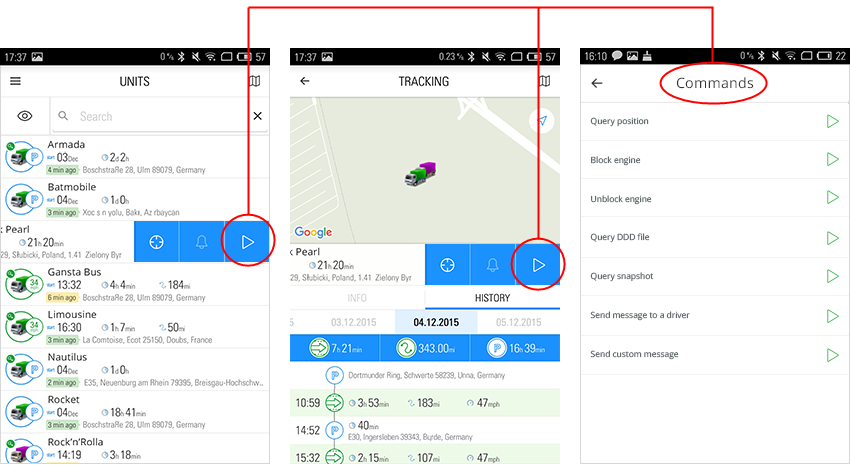 Switching to the command sending menu can be done either from the work list ('Units' mode) or from the 'Tracking' mode. To do so, swipe to the left in the line of the corresponding unit, tap triangle, and choose the necessary command.