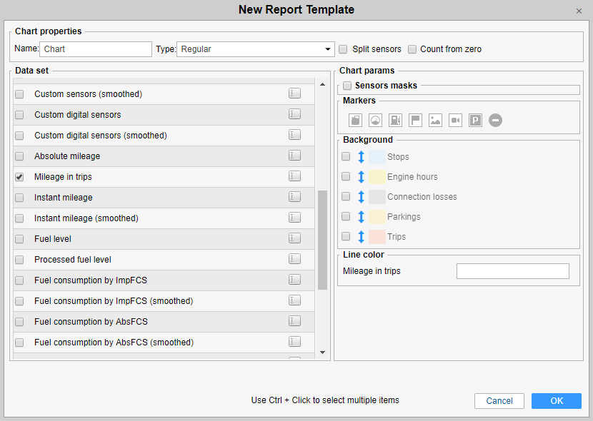 Then click Add Chart and select the required chart type (for example, mileage in trips). Note that many charts require the appropriate sensors. Press OK.