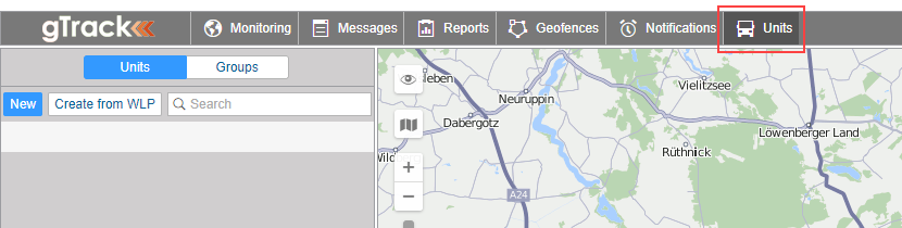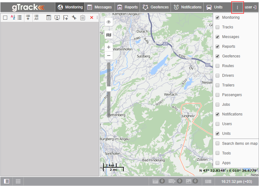 In the Quick Start section, you can read about working with some of the panels. Adjust the main menu and select the panels which you want to work with, such as: Monitoring, Messages, Reports, Geofences, Notifications, Units.